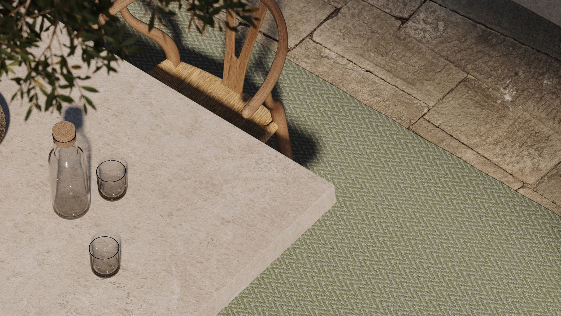 Beneath the dining table, the Drifts rug adds texture and definition to this outdoor space. Its delicate pattern and soft color palette blend harmoniously with the natural elements around, creating a smooth visual connection that enhances both the modern furniture and the outdoor setting.