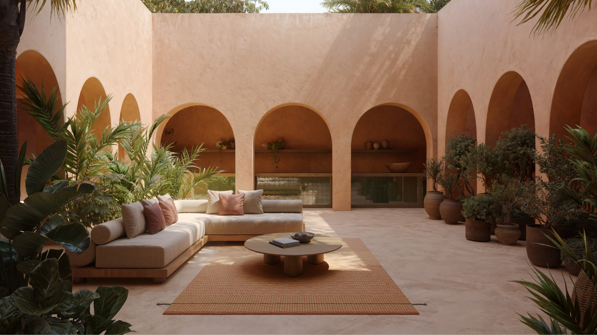 Framed by warm terracotta-toned walls and surrounded by vibrant foliage, the Cascade rug stands out as the central element in this lounge area. Under the gentle shade of the arches, which delicately filter the sunlight, this rug enhances the space with its distinct texture and welcoming pattern.