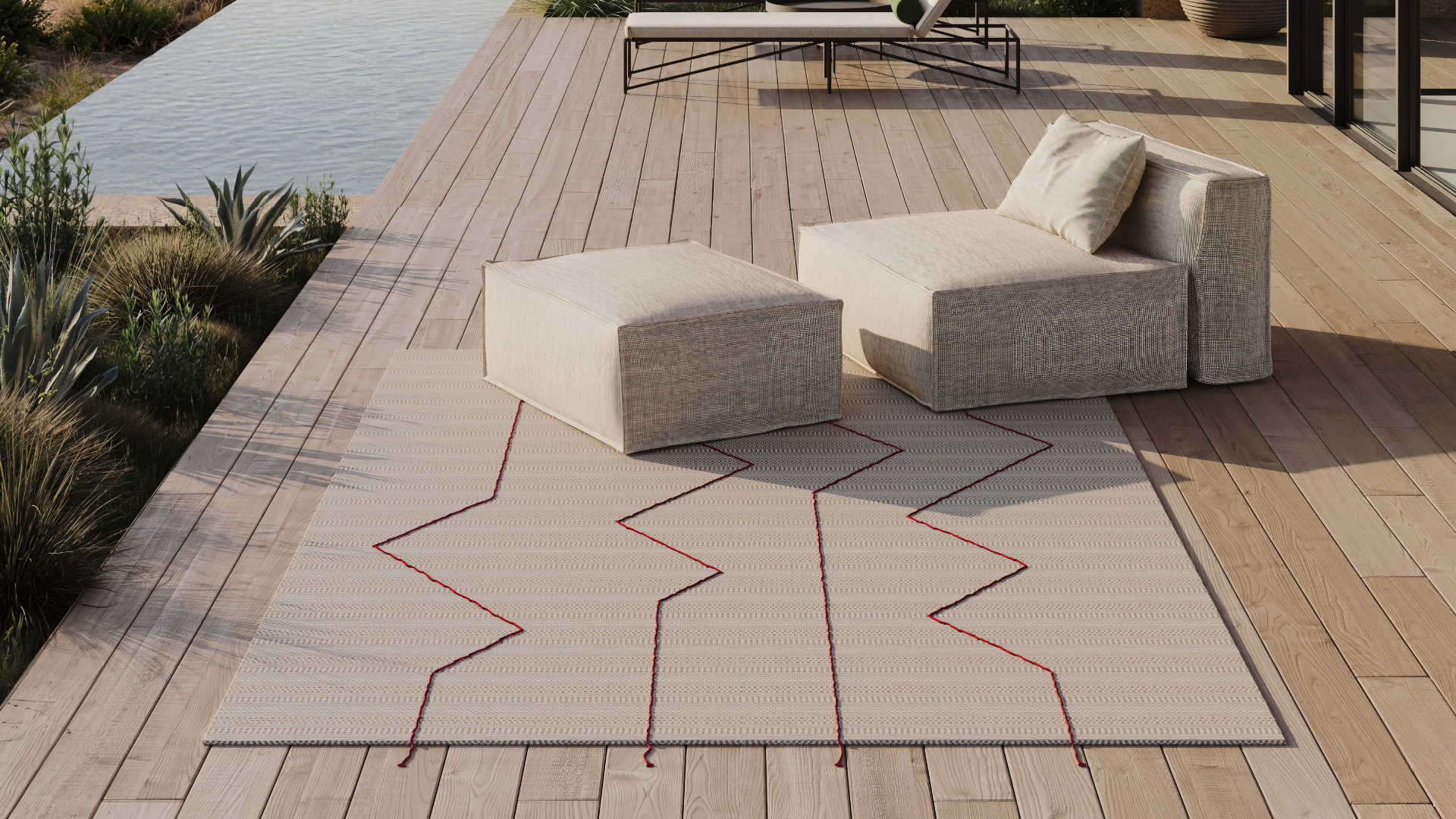 The Trails rug complements this serene poolside setting, where the fresh gleam of the infinity pool meets the earthy warmth of the wooden deck. Its elevated linear design, handwoven with an embroidered effect, adds texture and sophistication, creating a grounding element in this minimalist outdoor retreat.