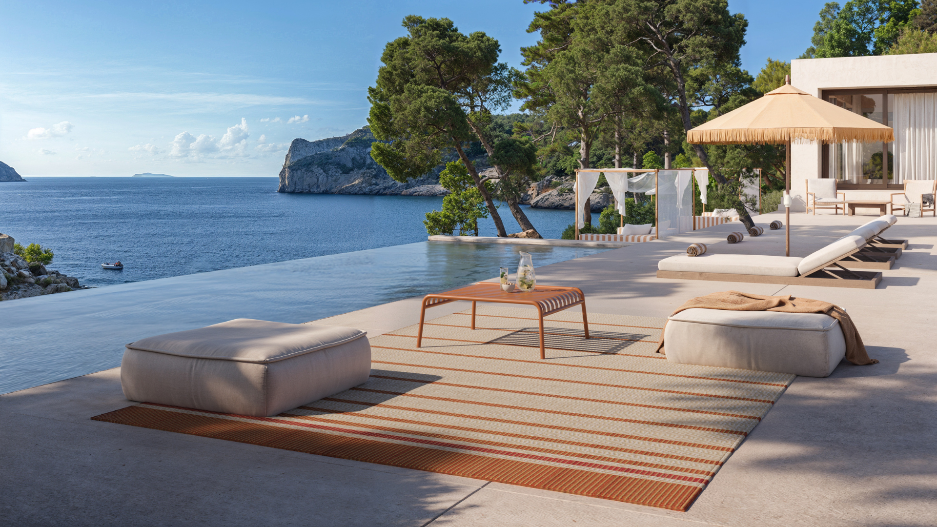 The Flowstone rug in Clay color integrates perfectly into this poolside setting, with its warm and earthy tones echoing the natural colors of the surrounding landscape. Its striped design creates subtle movement, complementing the clean lines of the infinity pool and enhancing the connection with the outdoors.